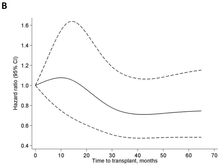 White LN-ESRD patients who were transplanted later (vs. <3 months on dialysis) were at increased risk of graft failure [adjusted HR (95% confidence interval): 3–12 months, 1.23 (0.93–1.63); 12–24 months, 1.37 (0.92–2.06); 24–36 months, 1.34 (0.92–1.97); and >36 months, 1.98 (1.31–2.99)]. However, no such association was seen among black recipients [3–12 months, 1.07 (0.79–1.45); 12–24 months, 1.01 (0.64–1.60); 24–36 months, 0.78 (0.51–1.18); and >36 months, 0.74 (0.48–1.13)].