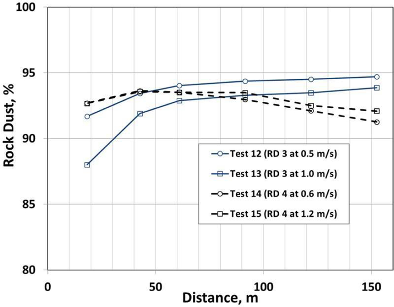 Description:Correctly applied rock dust can dilute, inert, and mitigate the explosive potential of float coal dust. Trickle dusters are one element of a comprehensive system to help prevent coal dust explosions in underground coal mines. Trickle dusters supply rock dust to inert fine float coal dust in areas where it is commonly deposited, such as the longwall tailgate returns, return airways, pillaring areas, and downwind of belt transfers. Dust deposition studies show that the effectiveness of trickle dusters depends on several key factors. Using multiple orifices, rock dust should be released near the mine roof in the direction of the airflow in order to spread the cloud cross the entry. The rock duster should have a mechanism to break up rock dust agglomerates as they leave the rock duster. The particle size distribution of the limestone rock dust and its airborne concentration should be proportional to the airborne size distribution and concentration of coal dust passing by the trickle duster. Specifically, rock dusts having a greater proportion of <74 µm material are more effective at minimizing downwind zones of explosible mixtures than mostly larger particles. In our testing, rock dusts having more than 95% of <74 µm sized particles were adequately dispersed by trickle dusters. Based on our results, the mass rate of rock dust discharge from the trickle duster should exceed the rate of float coal production by at least a factor of four in order to minimize accumulations of explosible dusts.