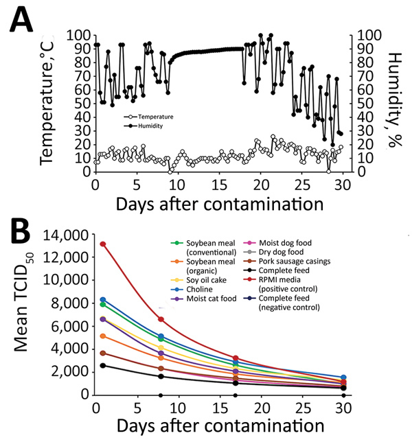 Description:African swine fever virus is transmissible through animal consumption of contaminated feed. To determine virus survival during transoceanic shipping, we calculated the half-life of the virus in 9 feed ingredients exposed to 30-day shipment conditions. Half-lives ranged from 9.6 to 14.2 days, indicating that the feed matrix environment promotes virus stability.