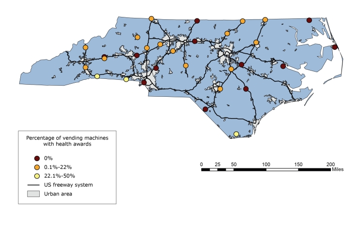 We conducted a cross-sectional audit of all rest areas offering foods and beverages in North Carolina (N = 30) in summer 2018. We used the Nutrition Environment Measures Survey–Vending (NEMS–V) to record the 1) type, price, and size of all foods and beverages and 2) healthfulness of items offered (based on NEMS–V categorization). Two researchers independently double coded NEMS–V data. We used geospatial analysis to examine proximity of rest areas to food stores. We analyzed data by using univariate and bivariate analysis.