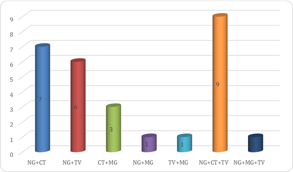 Of the 200 women, 146 (73%) had an etiology detected, including bacterial vaginosis (24.7%); N. gonorrhoeae (24.0%); yeast infection (20.7%); T. vaginalis (19.0%); C. trachomatis (14.0%) and M. genitalium (7.0%). Among women with STIs (N=90), 62 (68.9%) had a single infection, 18 (20.0%) had a dual infection and 10 (11.1%) had three infections.
