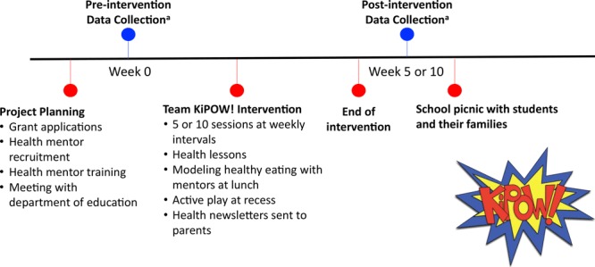 Team Kid POWER! (KiPOW!) health mentors (students and trainees in medical and health-related fields) in 2 geographically and demographically distinct school districts, the District of Columbia and Orange County, California, delivered standardized health curricular modules to fifth grade classrooms, modeled healthy eating behaviors during school lunchtime, and engaged in active play at recess.