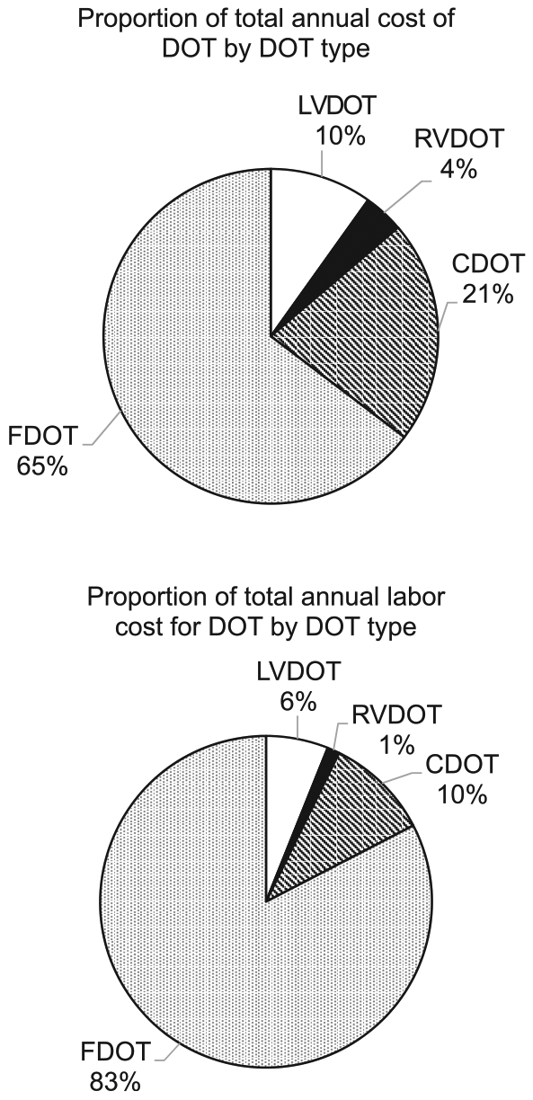 Program data covering the study period from September 2014 to August 2015 in New York City (NYC) were used to conduct a retrospective bottom-up micro-costing economic evaluation. For each DOT type, potential per-session and annual program savings were estimated as the cost averted by adopting a uniform distribution of DOT alternatives. Sensitivity analyses explored aggregate cost impacts of unequal distributions.