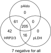 Of 2695 DBS tested for Plasmodium DNA, 345 (12.8%) were originally found to be positive for P. falciparum DNA; 331 of these had DBS available for antigen detection. Of these, 266 (80.4%) were positive for pAldo, 221 (66.8%) positive for pLDH, and 324 (97.9%) were positive for HRP2/3 antigens. Seven samples (2.1%) positive for P. falciparum DNA were not positive for any of the three antigens by the bead assay, and were investigated for potential Pfhrp2/3 gene deletion by PCR. These samples either successfully amplified Pfhrp2/3 genes or were at an estimated parasite density too low for sufficient DNA to perform successful genotyping.