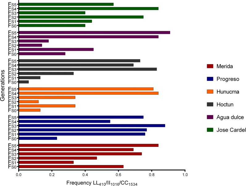 There was an increase in KC50 and LC50 values in the subsequent generations of selection with deltamethrin (FS5vs FS0). According to the resistance ratios (RRs), we detected increases in LC50 ranging from 1.5 to 5.6 times the values of the parental generation and in KC50 ranging from 1.3–3.8 times the values of the parental generation. Triple homozygous mutant individuals (tri-locus, LL/II/CC) were present in the parental generations and increased in frequency after selection. The frequency of L410 increased from 1.18-fold to 2.63-fold after selection with deltamethrin (FS5vs FS0) in the populations analyzed; for I1016 an increase between 1.19-fold to 2.79-fold was observed, and C1534 was fixed in all populations after deltamethrin selection. Enzymatic activity varied significantly over the generations of selection. However, only α- esterase activity remained elevated in multiple populations after five generations of deltamethrin selection. We observed an increase in the mean activity levels of GSTs in two of the six populations analyzed.