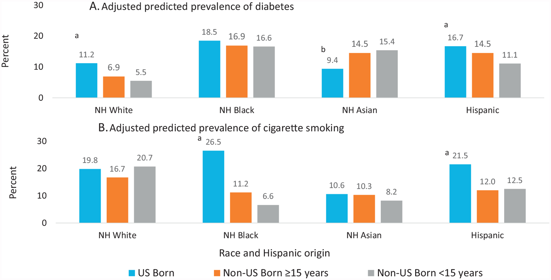 Description:Differences by nativity status for cardiovascular disease (CVD) risk factors have been previously reported. Recent research has focused on understanding how other acculturation factors, such as length of residence, affect health behaviors and outcomes. This study examines the association between CVD risk factors and nativity/length of US residence. Using cross-sectional data from 15,965 adults in the 2011-2016 National Health and Nutrition Examination Surveys (analyzed in 2018), prevalence ratios and predicted marginals from logistic regression models are used to estimate associations of CVD risk factors (i.e., hypertension, hypercholesterolemia, diabetes, overweight/obesity and smoking) with nativity/length of residence (<15 years, ≥15 years) in the US. In sex-, age-, education- and race and Hispanic origin- adjusted analyses, a higher percentage of US (50 states and District of Columbia) born adults (86.4%) had ≥1 CVD risk factor compared to non-US born residents in the US <15 years (80.1%) but not ≥15 years (85.1%). Compared to US born counterparts, regardless of length of residence, hypertension overall and smoking among non-Hispanic white and Hispanic adults were lower among non-US born residents. Overweight/obesity overall and diabetes among Hispanic adults were lower among non-US born residents in the US <15 years. In contrast, non-US born non-Hispanic Asian residents in the US <15 years had higher prevalence of diabetes. Non-US born adults were less likely to have most CVD risk factors compared to US born adults regardless of length of residence, although, for smoking and diabetes this pattern differed by race and Hispanic origin.