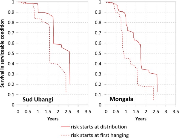 A total of 754 campaign nets (109% of target) from 240 households were included in the study. Definite outcomes could be determined for 67% of the cohort nets in Sud Ubangi and 74% in Mongala. After 31 months all-cause attrition was 57% in Sud Ubangi and 76% in Mongala (p = 0.005) and attrition due to wear and tear was 26% in Sud Ubangi and 48% in Mongala (p = 0.0009). Survival in serviceable condition at the last survey was 37% in Sud Ubangi and 17% in Mongala (p = 0.003). Estimated median survival was 1.6 years for the DawaPlus® 2.0 in Mongala (95% CI 1.3–1.9) and 2.2 years for the DuraNet in Sud Ubangi (95% CI 2.0–2.4). Multivariable Cox proportionate hazard models suggest that the difference between sites was mainly attributable to the LLIN brand. Insecticidal effectiveness was optimal for DuraNet©, but significantly dropped after 24 months for DawaPlus® 2.0.