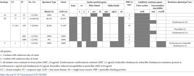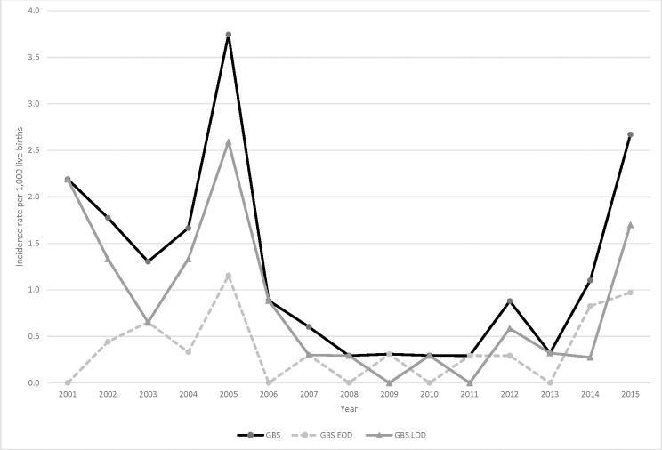 There were 437 IBD cases, including 57 GBS cases. Significant declines in overall IBD, neonatal mortality, and stillbirth rates were observed (P<0.0001), but not for GBS (P = 0.17). In 2015, GBS was the leading cause of young infant IBD (2.7 per 1,000 live births). Among 35 GBS isolates available for testing, 31 (88.6%) were highly related serotype III isolates within multilocus sequence types (STs) 17 (68.6%) or 109 (20.0%). All seven ST109 isolates (21.9%) had elevated minimum inhibitory concentration (MIC) to penicillin (≥0.12 μg/mL) associated with penicillin-binding protein (PBP) 2x substitution G398A. Epidemiologic and molecular data suggest this is a well-established clone.