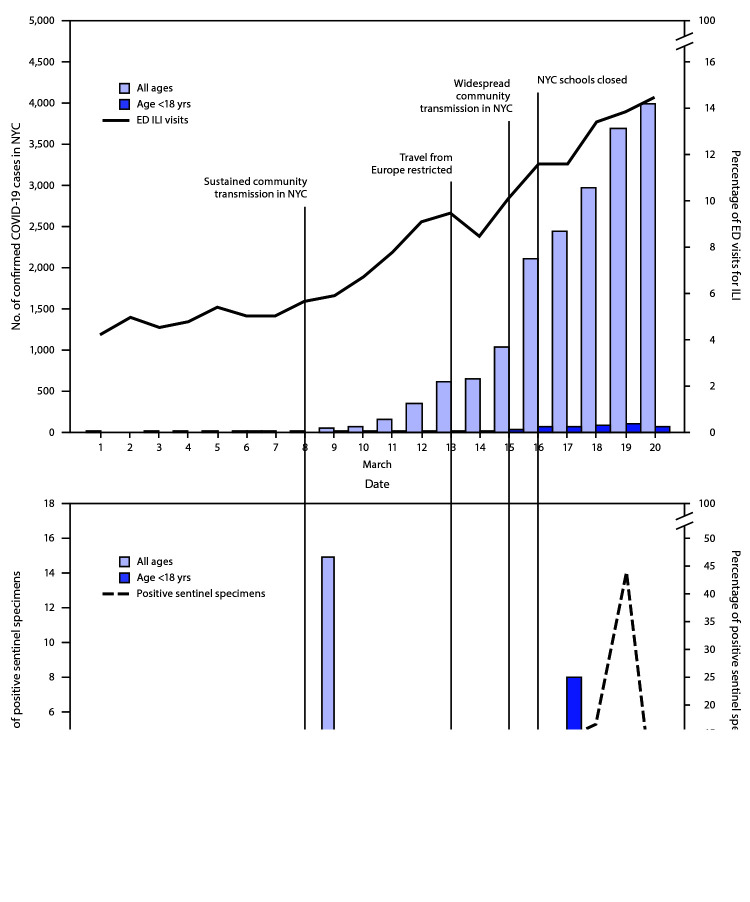 Description:To limit introduction of SARS-CoV-2, the Virus that causes coronaVirus disease 2019 (COVID-19), the United States restricted travel from China on February 2, 2020, and from Europe on March 13. To determine whether local Transmission of SARS-CoV-2 could be detected, the New York City (NYC) Department of Health and Mental Hygiene (DOHMH) conducted deidentified sentinel Surveillance at six NYC hospital emergency departments (EDs) during March 1-20. On March 8, while tTesting availability for SARS-CoV-2 was still limited, DOHMH announced sustained community Transmission of SARS-CoV-2 (1). At this time, twenty-six NYC residents had confirmed COVID-19, and ED visits for influenza-like illness* increased, despite decreased influenza Virus circulation.| The following week, on March 15, when only seven of the 56 (13%) patients with known exposure Historyies had exposure outside of NYC, the level of community SARS-CoV-2 Transmission status was elevated from sustained community Transmission to widespread community Transmission (2). Through sentinel Surveillance during March 1-20, DOHMH collected 544 specimens from patients with influenza-like symptoms (ILS)| who had negative test results for influenza and, in some instances, other respiratory pathogens.| All 544 specimens were tested for SARS-CoV-2 at CDC; 36 (6.6%) tested positive. Using genetic sequencing, CDC determined that the sequences of most SARS-CoV-2-positive specimens resembled those circulating in Europe, suggTesting probable introductions of SARS-CoV-2 from Europe, from other U.S. locations, and local introductions from within New York. These findings demonstrate that partnering with health care facilities and developing the systems needed for rapid implementation of sentinel Surveillance, coupled with capacity for genetic sequencing before an outbreak, can help inform timely containment and mitigation strategies.