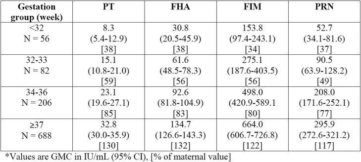 We collected paired maternal delivery-cord sera from infants of women who received Tdap ≥7 days before birth. IgG to pertussis toxin (PT), filamentous hemagglutinin (FHA), fimbrial proteins (FIM) and pertactin (PRN) was quantified by Luminex assay (IU/mL). Geometric mean concentrations (GMC) with 95% confidence intervals (CI) for pertussis antibodies were calculated. Four infant groups were compared by weeks of gestation: very (<32), moderate (32–33) and late preterm (34–36), and term (≥37).