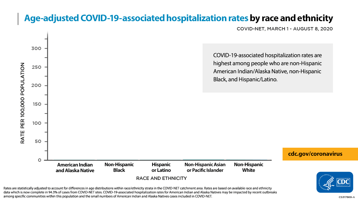 Description:As of August 8, age-adjusted hospitalization rates are highest among certain racial and ethnic minority groups, according to CDC’s COVID-NET.