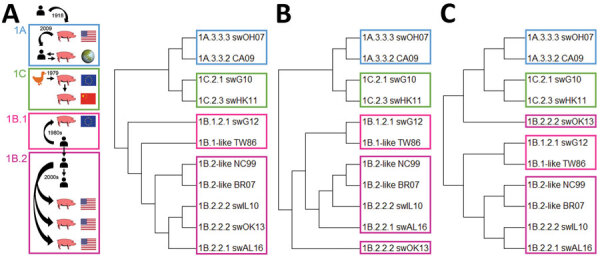Description:Most H1 influenza A viruses (IAVs) of swine are derived from past human viruses. As human population immunity against these IAVs gradually decreases, the risk of reintroduction to humans increases. We examined 549 serum samples from persons 0-97 years of age collected in Belgium during 2017-2018 for hemagglutination inhibiting and virus neutralizing antibodies against 7 major H1 swine IAV (swIAV) clades and 3 human progenitor IAVs. Seroprevalence (titers >40) rates were >50% for classical swine and European human-like swIAVs, >24% for North American human-like δ1a and Asian avian-like swIAVs, and <10% for North American human-like δ1b and European avian-like swIAVs, but rates were age-dependent. Antibody titers against human-like swIAVs and supposed human precursor IAVs correlated with correlation coefficients of 0.30-0.86. Our serologic findings suggest that European avian-like, clade 1C.2.1, and North American human-like δ1b, clade 1B.2.2.2, H1 swIAVs pose the highest pandemic risk.