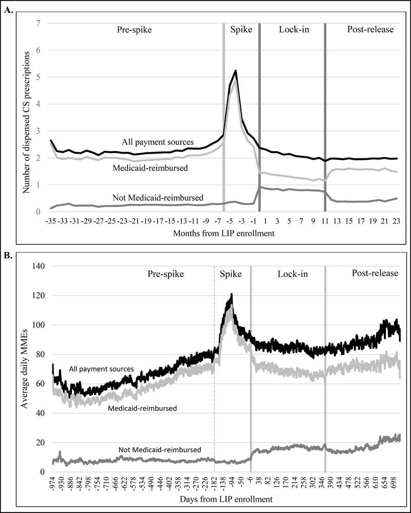 Compared to a period of stable CS dispensed prior to LIP enrollment, numbers of dispensed CS during lock-in and post-release were lower (count difference per person-month: −0.05 (95% CI: −0.11, 0.01); −0.23 (95% CI: −0.31, −0.15), respectively). However, beneficiaries’ average daily MMEs of opioids were elevated during both lock-in and post-release (daily mean difference per person: 18.7 (95% CI: 13.9, 23.6); 11.1 (95% CI: 5.1, 17.1), respectively). Stratification by payer source revealed increases in using non-Medicaid (e.g., out-of-pocket) payment during lock-in that persisted following release.