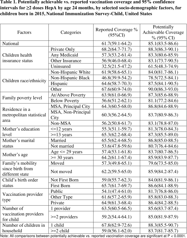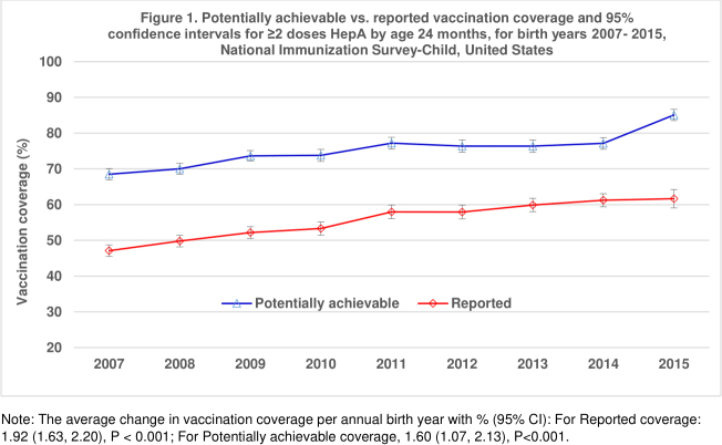 We analyzed National Immunization Survey-Child data for 2008–2017 in the United States. We defined potentially achievable ≥2 HepA coverage by age 24 months as the possible coverage if opportunities for simultaneous administration with other age-appropriate doses of vaccines for children by age 24 months had not been missed. We compared potentially achievable vaccination coverage to reported ≥2 HepA vaccination coverage by birth years 2007 to 2015. For children born in 2015, we stratified estimates by state and by selected socio-demographic factors. Both potentially achievable and reported ≥2 HepA coverage were evaluated using a Kaplan–Meier survival procedure to account for censoring of vaccination status.