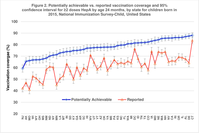 Compared with reported vaccination coverage, potentially achievable coverage for ≥2 HepA was at least 10 percentage points higher across birth years 2007 to 2015 and would have surpassed the 85% target of Healthy People 2020 for children born in 2015 (Figure 1). For the 2015 birth cohort, potentially achievable ≥2 HepA coverage exceeded the 85% Healthy People 2020 target in ten states (Figure 2). In addition, potentially achievable vaccination coverage was higher than reported coverage across all selected socio-demographic factors, with differences ranging from 20.1 percentage-points (private insurance only) to 31.7 percentage-points (non-Hispanic Black) (Table 1).