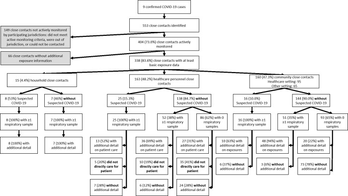 Description:Coronavirus disease 2019 (COVID-19), the respiratory disease caused by severe acute respiratory syndrome coronavirus 2 (SARS-CoV-2), was first identified in Wuhan, China and has since become pandemic. In response to the first cases identified in the United States, close contacts of confirmed COVID-19 cases were investigated to enable early identification and isolation of additional cases and to learn more about risk factors for transmission. Close contacts of nine early travel-related cases in the United States were identified and monitored daily for development of symptoms (active monitoring). Selected close contacts (including those with exposures categorized as higher risk) were targeted for collection of additional exposure information and respiratory samples. Respiratory samples were tested for SARS-CoV-2 by real-time reverse transcription polymerase chain reaction at the Centers for Disease Control and Prevention. Four hundred four close contacts were actively monitored in the jurisdictions that managed the travel-related cases. Three hundred thirty-eight of the 404 close contacts provided at least basic exposure information, of whom 159 close contacts had ≥1 set of respiratory samples collected and tested. Across all actively monitored close contacts, two additional symptomatic COVID-19 cases (i.e., secondary cases) were identified; both secondary cases were in spouses of travel-associated case patients. When considering only household members, all of whom had ≥1 respiratory sample tested for SARS-CoV-2, the secondary attack rate (i.e., the number of secondary cases as a proportion of total close contacts) was 13% (95% CI: 4-38%). The results from these contact tracing investigations suggest that household members, especially significant others, of COVID-19 cases are at highest risk of becoming infected. The importance of personal protective equipment for healthcare workers is also underlined. Isolation of persons with COVID-19, in combination with quarantine of exposed close contacts and practice of everyday preventive behaviors, is important to mitigate spread of COVID-19.