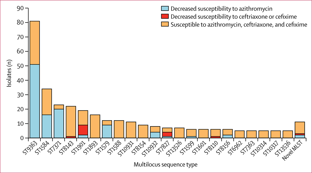 The number of cases of gonorrhoea in the USA and worldwide caused by Neisseria gonorrhoeae is increasing (555 608 reported US cases in 2017, and 87 million cases worldwide in 2016). Many countries report declining in vitro susceptibility of azithromycin, which is a concern because azithromycin and ceftriaxone are the recommended dual treatment in many countries. We aimed to identify strain types associated with decreased susceptibility to azithromycin.