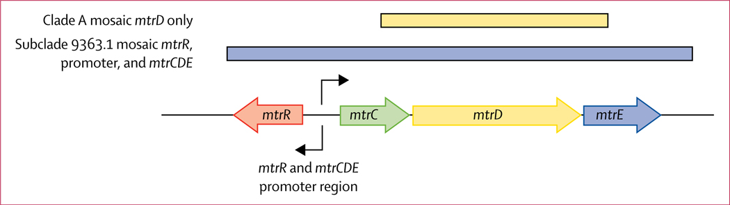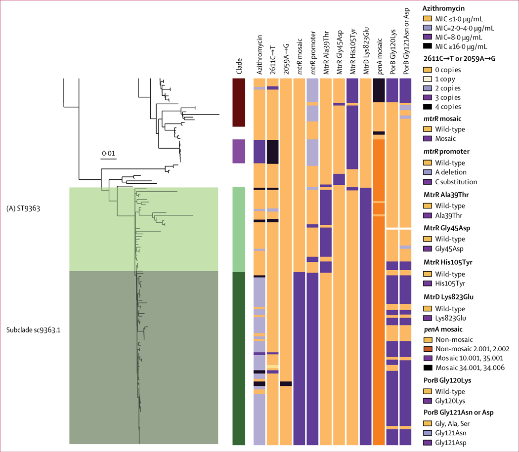 410 isolates were sorted into more than 20 unique phylogenetic clades. One predominant persistent clade (consisting of 97 isolates) included the most isolates with azithromycin MICs of 2 μg/mL or higher (61 of 97 [63%] vs 59 of 311 [19%]; p<0·0001) and carried a mosaic mtr (multiple transferable resistance) locus (68 of 97 [70%] vs two of 313 [1%]; p<0·0001). Of the remaining 313 isolates, 57 (18%) had decreased susceptibility to azithromycin (MIC ≥4 μg/mL), which was attributed to 23S rRNA variants (56 of 57 [98%]) and formed phylogenetically diverse clades, showing various levels of clonal expansion.