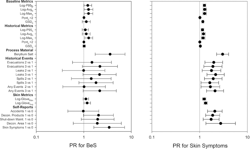 In a survey of short-term workers employed at a primary beryllium manufacturing facility between the years 1994–1999, 264 participants completed a questionnaire and were tested for BeS. A range of qualitative and quantitative peak inhalation metrics and skin exposure indices were created using: personal full-shift beryllium exposure measurements, 15 min to 24 h process-specific task and area exposure measurements, glove measurements as indicator of skin exposure, process-upset information gleaned from historical reports, and self-reported information on exposure events. Hierarchical clustering was conducted to systematically group participants based on similarity of patterns of 16 exposure variables. The associations of the exposure metrics with BeS and self-reported skin symptoms (in work areas processing beryllium salts as well as in other work areas) were evaluated using correlation analysis, log-binomial and logistic regression models with splines.