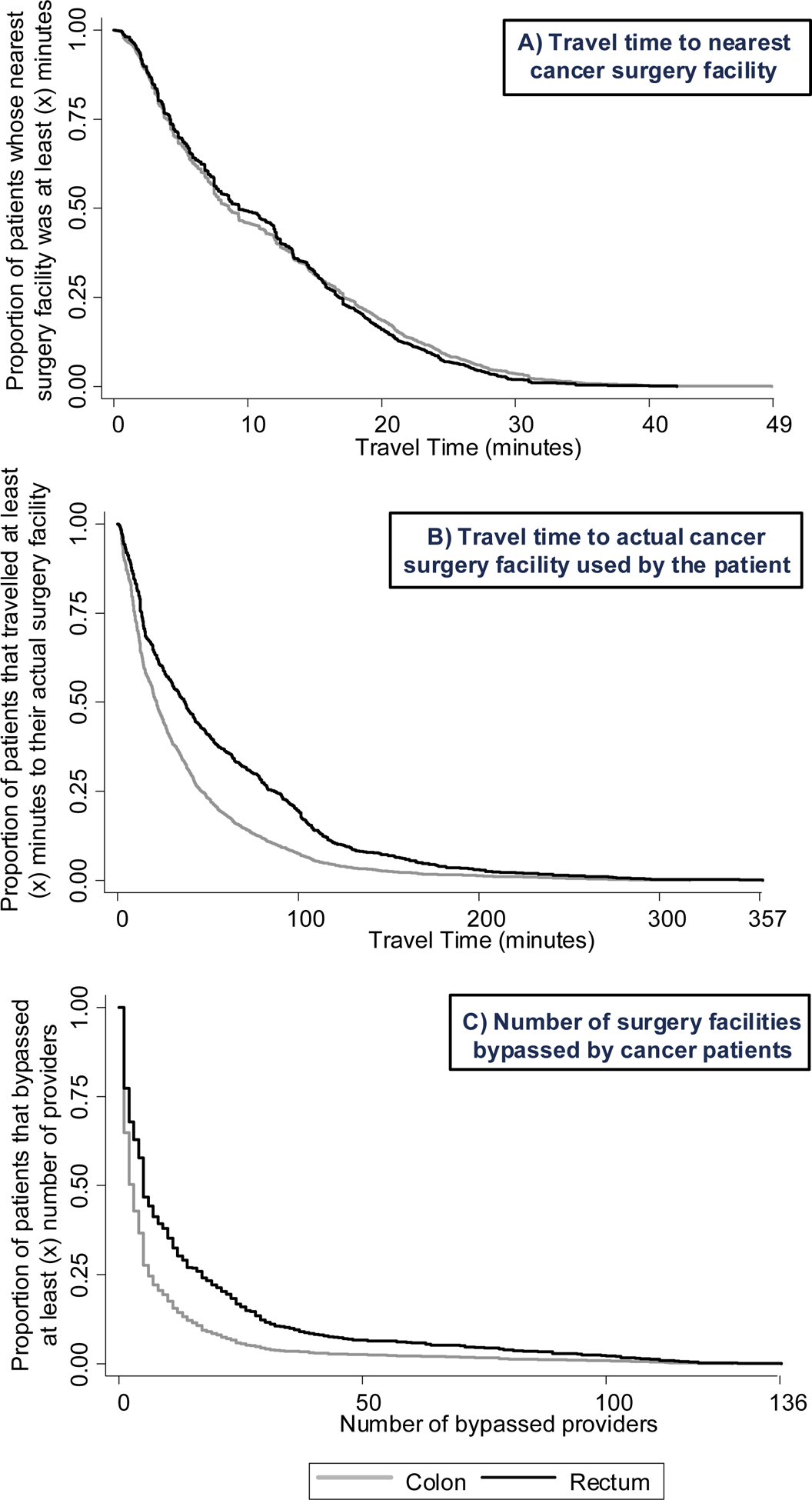 5,844 CRC patients met inclusion criteria. Median travel time to the nearest surgical facility was 9 minutes, median travel time to the actual cancer surgery facilities was 22 minutes, and the median number of facilities bypassed was 3 facilities. While travel times to the nearest surgery facility were not significantly different for colon versus rectal cancer patients, rectal cancer patients traveled 15 minutes longer to their actual surgery facility and bypassed 2 more facilities to obtain surgery.
