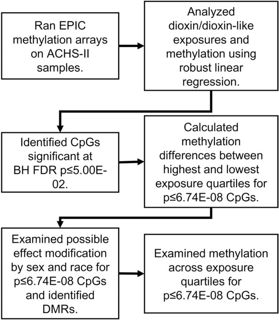 Description:The Anniston Community Health Survey (ACHS-I) was initially conducted from 2005 to 2007 to assess polychlorinated biphenyl (PCB) exposures in Anniston, Alabama residents. In 2014, a follow-up study (ACHS-II) was conducted to measure the same PCBs as in ACHS-I and additional compounds e.g., polychlorinated dibenzo-p-dioxins (PCDDs), polychlorinated dibenzofurans (PCDFs), and dioxin-like non-ortho (cPCBs) substituted PCBs. In this epigenome-wide association study (EWAS), we examined the associations between PCDD, PCDF, and PCB exposures and DNA methylation. Whole blood DNA methylation was measured using Illumina EPIC arrays (n=292). We modeled lipid-adjusted toxic equivalencies (TEQs) for: ΣDioxins (sum of 28 PCDDs, PCDFs, cPCBs, and mPCBs), PCDDs, PCDFs, cPCBs, and mPCBs using robust multivariable linear regression adjusting for age, race, sex, smoking, bisulfite conversion batch, and estimated percentages of six blood cell types. Among all exposures we identified 10 genome-wide (Bonferroni p≤6.74E-08) and 116 FDR (p≤5.00E-02) significant associations representing 10 and 113 unique CpGs, respectively. Of the 10 genome-wide associations, seven (70%) occurred in the PCDDs and four (40%) of these associations had an absolute differential methylation ≥1.00%, based on the methylation difference between the highest and lowest exposure quartiles. Most of the associations (six, 60%) represented hypomethylation changes. Of the 10 unique CpGs, eight (80%) were in genes shown to be associated with dioxins and/or PCBs based on data from the 2019 Comparative Toxicogenomics Database. In this study, we have identified a set of CpGs in blood DNA that may be particularly susceptible to dioxin, furan, and dioxin-like PCB exposures.