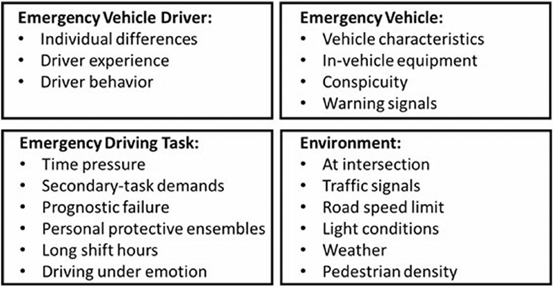 Major risk factors for emergency vehicle crashes identified in this study were organized into four categories: driver, task, vehicle, and environmental factors. Also, current countermeasures and interventions to mitigate the hazards of emergency vehicle crashes were discussed, and new ideas for future studies were suggested.
