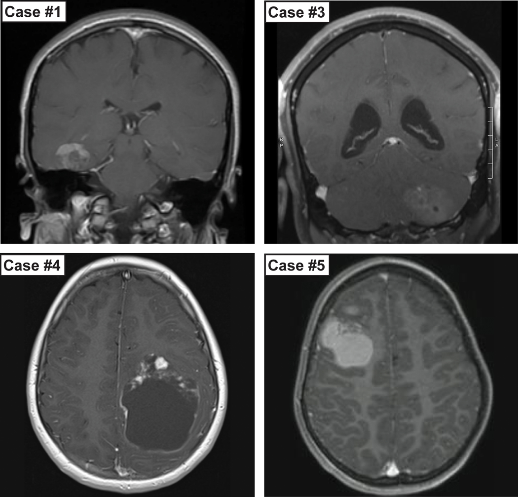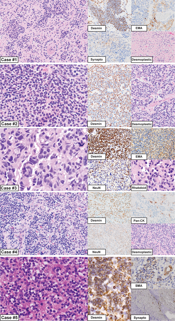 Description:Desmoplastic small round cell tumors (DSRCTs) are highly aggressive sarcomas that most commonly occur intra-abdominally, and are defined by EWSR1-WT1 gene fusion. Intracranial DSRCTs are exceptionally rare with only seven previously reported fusion-positive cases. Herein, we evaluate the clinical, morphologic, immunohistochemical and molecular features of five additional examples. All patients were male (age range 6-25 years; median 11 years), with four tumors located supratentorially and one within the posterior fossa. The histologic features were highly variable including small cell, embryonal, clear cell, rhabdoid, anaplastic and glioma-like appearances. A prominent desmoplastic stroma was seen in only two cases. The mitotic index ranged from <1 to 12/10 HPF (median 5). While all tumors showed strong desmin positivity, epithelial markers such as EMA, CAM 5.2 and other keratins were strongly positive in only one, focally positive in two and negative in two cases. EWSR1-WT1 gene fusion was present in all cases, with accompanying mutations in the TERT promoter or STAG2 gene in individual cases. Given the significant histologic diversity, in the absence of genetic evaluation these cases could easily be misinterpreted as other entities. Desmin immunostaining is a useful initial screening method for consideration of a DSRCT diagnosis, prompting confirmatory molecular testing. Demonstrating the presence of an EWSR1-WT1 fusion provides a definitive diagnosis of DSRCT. Genome-wide methylation profiles of intracranial DSRCTs matched those of extracranial DSRCTs. Thus, despite the occasionally unusual histologic features and immunoprofile, intracranial DSRCTs likely represent a similar, if not the same, entity as their soft tissue counterpart based on the shared fusion and methylation profiles.